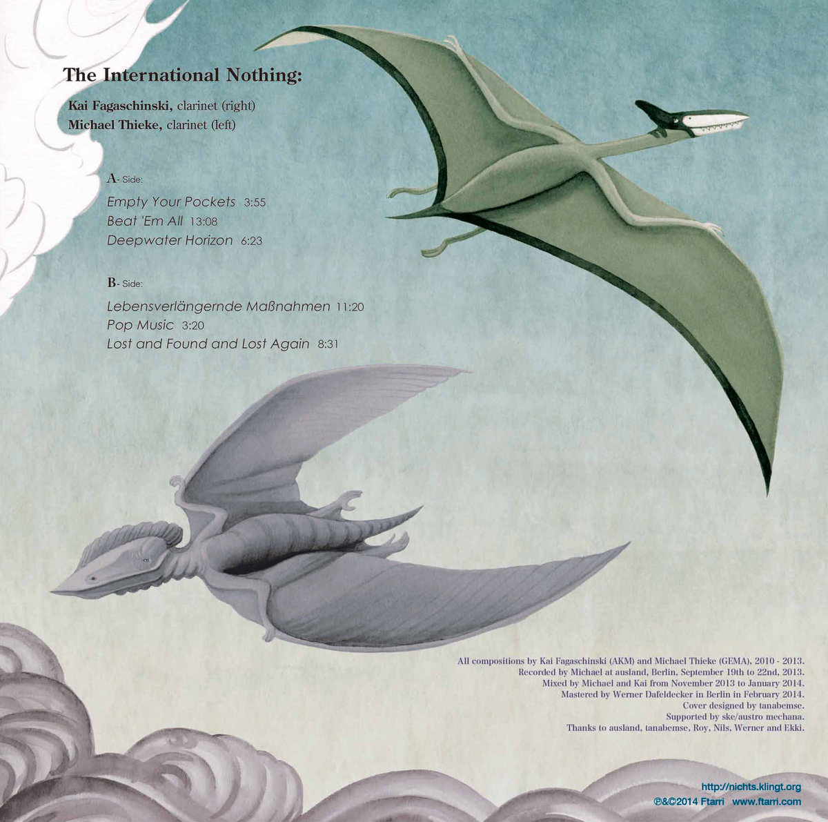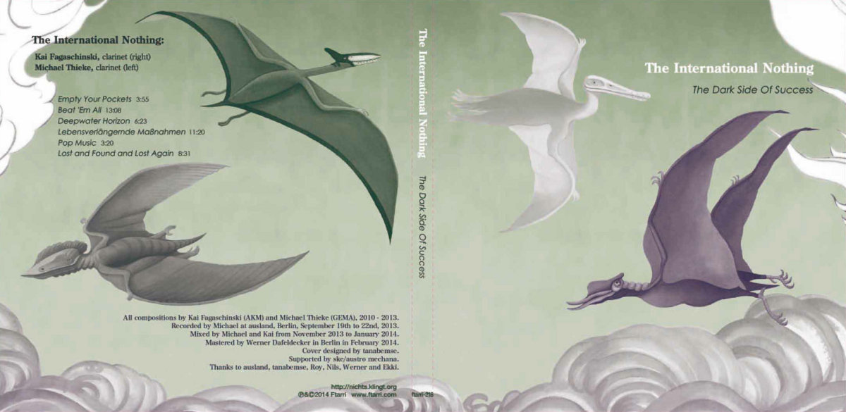 "The International Nothing, genauer gesagt, die Klarinettisten Kai Fagaschinski und Michael Thieke, bieten auf dieser Platte Eigenkompositionen dar, in denen sie die Fülle an Obertonmöglichkeiten ihrer beiden Instrumente differenziert ausloten und aufeinander abstimmen, sodass sie fast zu einem Klanggebilde verschmelzen, mal leicht, mal stark überblasen, jedoch nie so, wie man es von einer Klarinette gewohnt ist. Ihre Musik wirkt dabei so faszinierend fremdartig wie die Flugsaurier, die das Cover ihres Albums zieren."